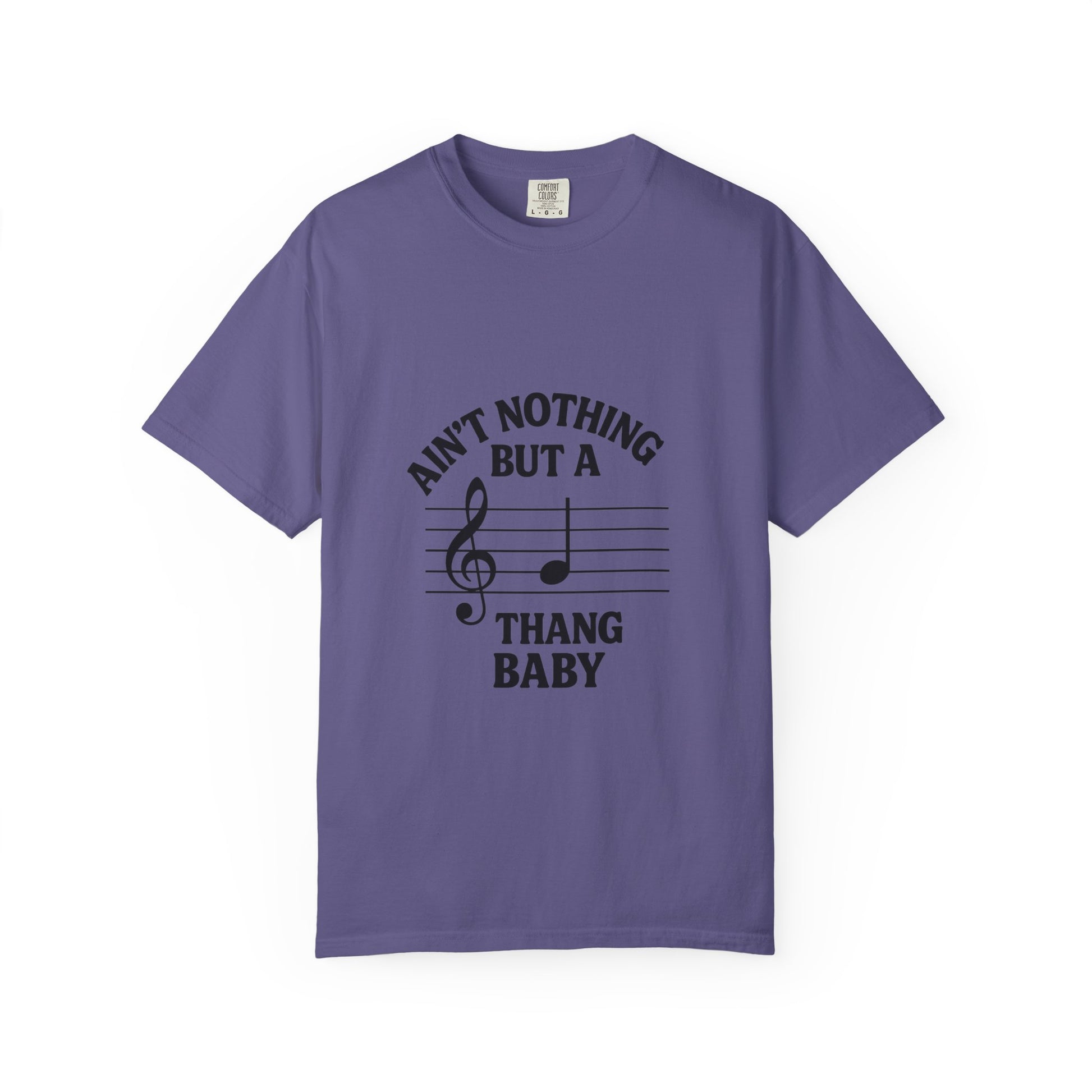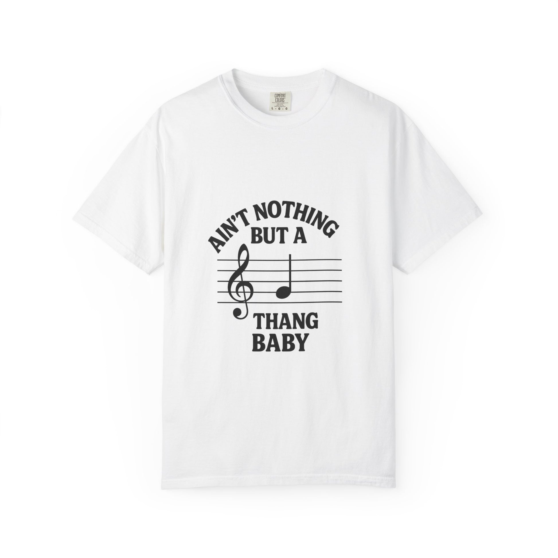 Drop a beat and make a statement with this bold and musical tee that speaks fluent treble clef. Featuring the iconic phrase “Ain’t Nothin’ But a G Thang Baby” wrapped around a perfectly placed G note on the staff, this shirt is perfect for musicians, music teachers, and anyone who appreciates a clever pun.