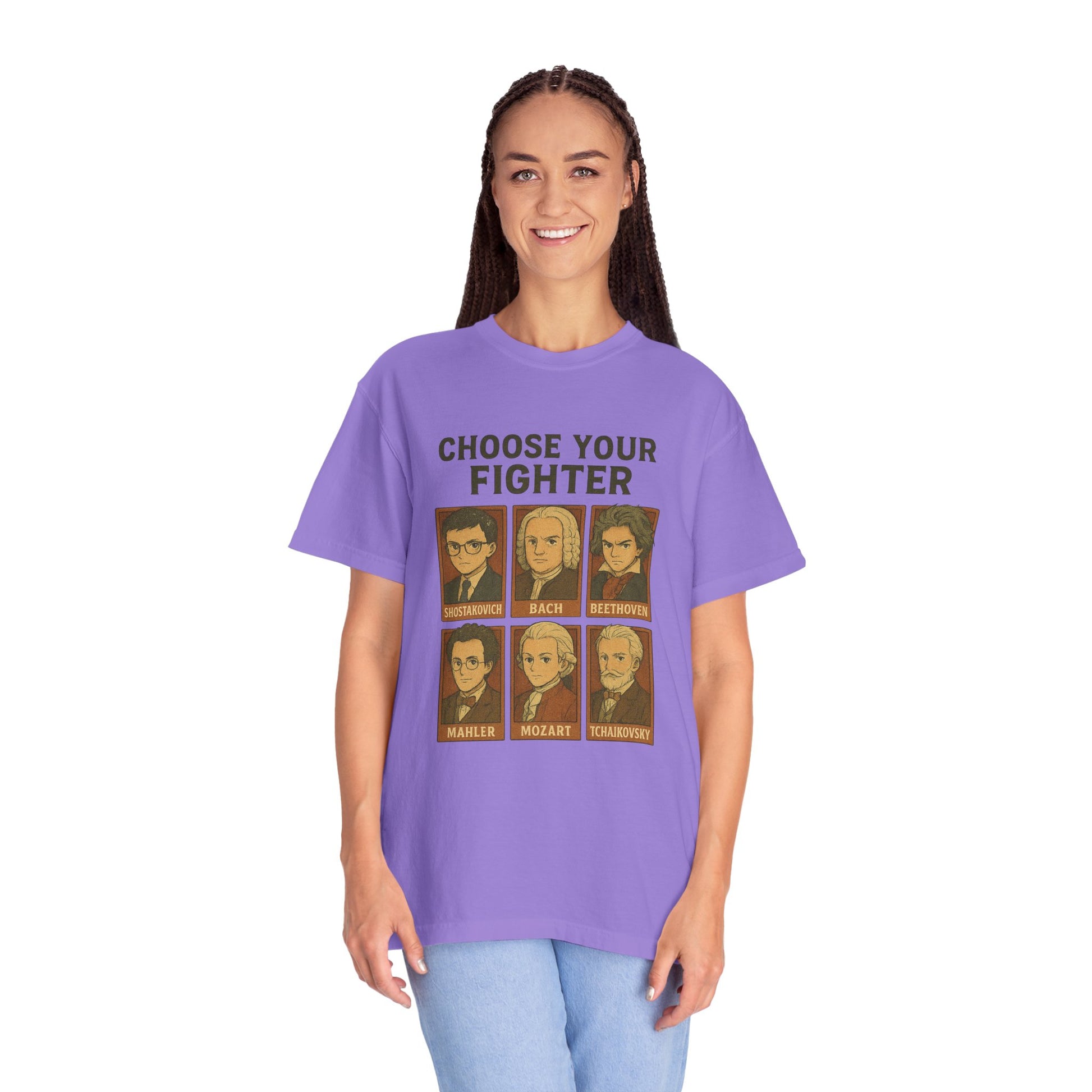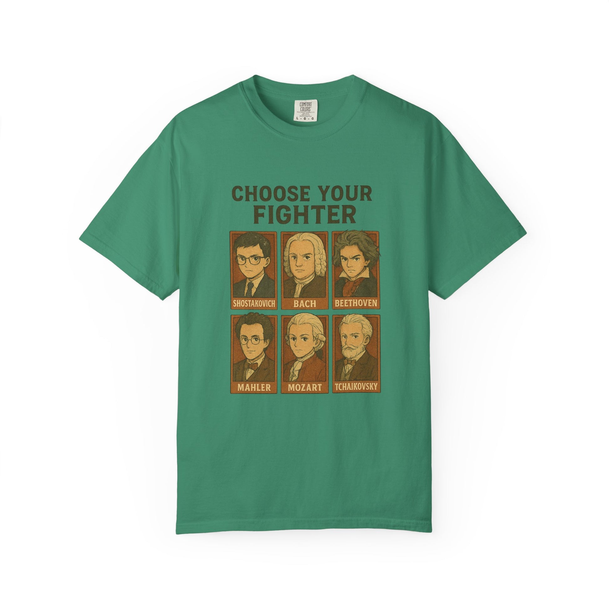Step into the ultimate showdown of genius with the Choose Your Fighter: Classical Legends tee. Featuring anime-style portraits of six iconic composers — Shostakovich, Bach, Beethoven, Mahler, Mozart, and Tchaikovsky — this shirt fuses high art with high drama. Each maestro is rendered in vibrant vintage tones and bold manga flair, ready to throw down… sonata-style.