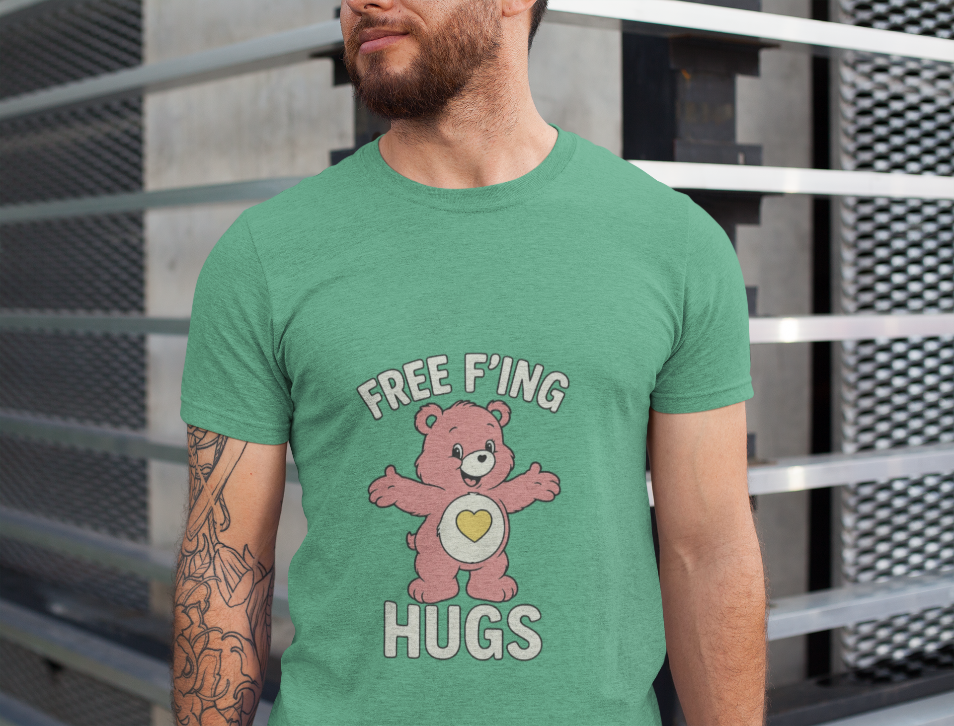 Bring the hugs, bring the attitude. This retro-inspired graphic tee features a playful bear with arms wide open and a bold “Free F’ing Hugs” slogan that gets the message across loud and clear. Vintage distressed lettering gives it that throwback vibe, while the bright, colorful design keeps things fun and eye-catching. Perfect for anyone with a sense of humor who loves making a statement, this shirt is as comfortable as it is cheeky.